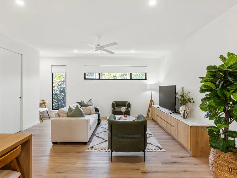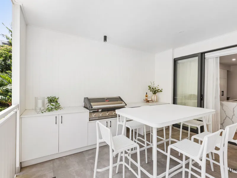 Entertain, or relax and unwind in your bright & breezy open plan living space. Featuring a beautiful chef's kitchen with integrated European appliances. The stone island bench sits at the center of the kitchen with a connected central timber dining table.