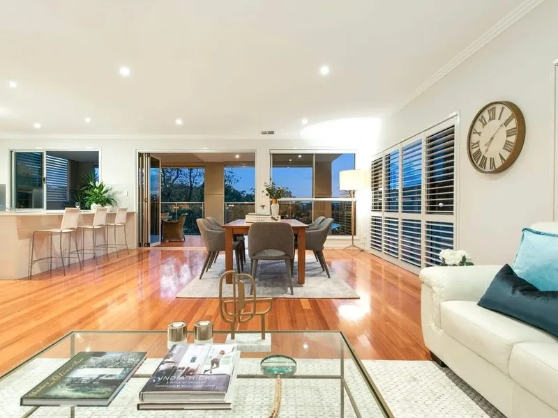 Arranged over three levels, and tastefully furnished, the home offers light-filled living and dining spaces, a central gourmet kitchen with stone surfaces, European appliances, and excellent storage.