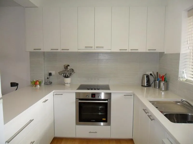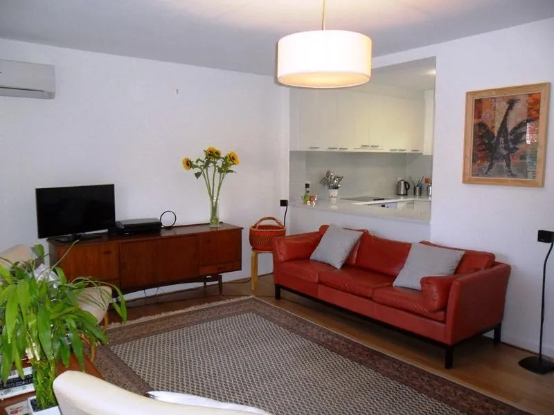 This furnished apartment is situated on the first floor and features two generously sized bedrooms, with the master bedroom complete with a built-in robe. The kitchen offers a matte white benchtop and ample storage, overlooking the open plan living and dining area.