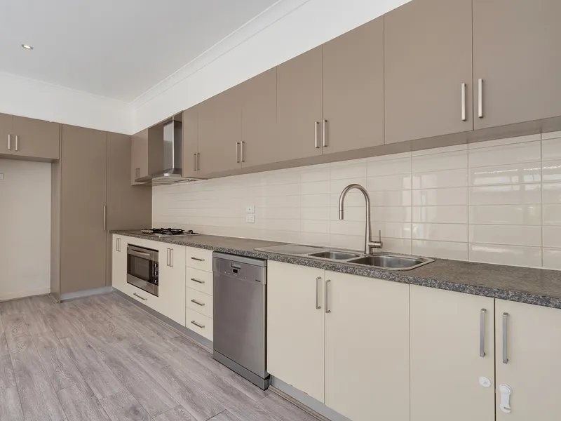 Modern and spacious kitchen featuring a dishwasher, stainless steel appliances and ample cupboard space.