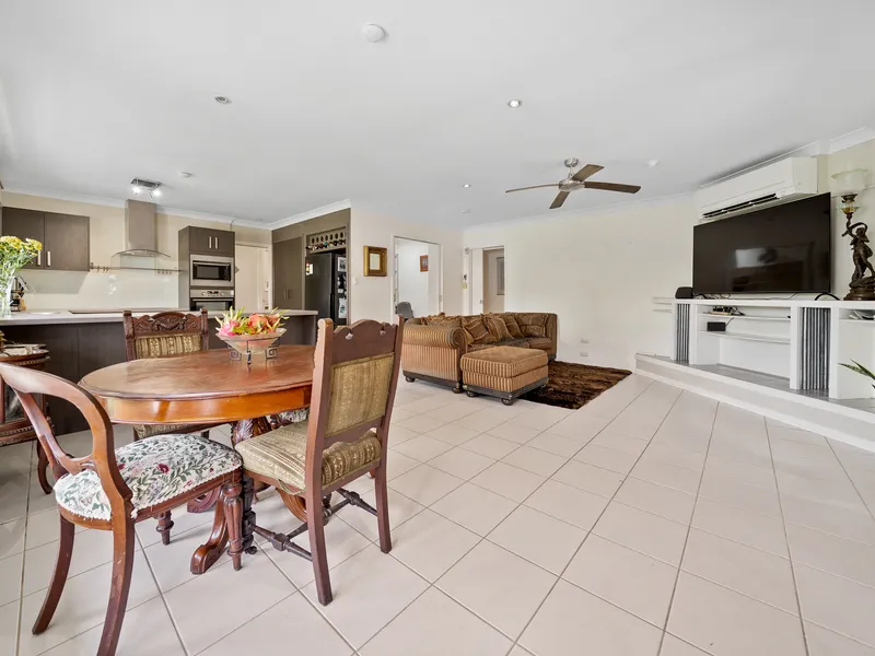 Inside, you are welcomed by an open-plan living and dining area filled with natural light. The layout is both practical and inviting, complete with ceiling fans and air-conditioning to ensure year-round comfort. The modern kitchen overlooks the living space and outdoor entertaining area, featuring ample bench space, electric oven and cooktop, dishwasher, generous pantry and excellent cupboard storage.