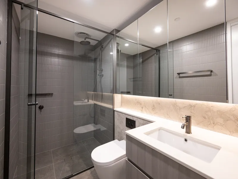 - Ensuite style modern bathroom with mirrored storage and two way access