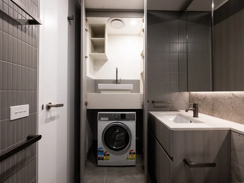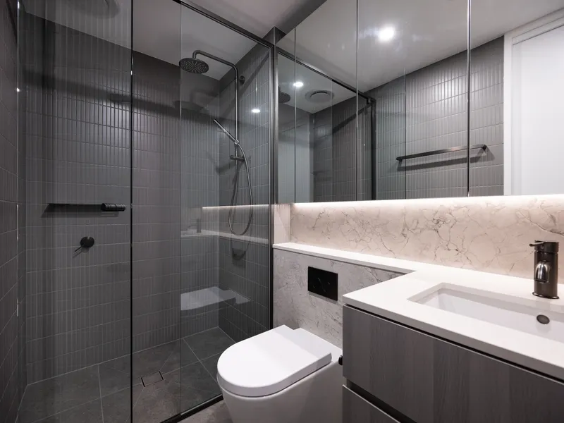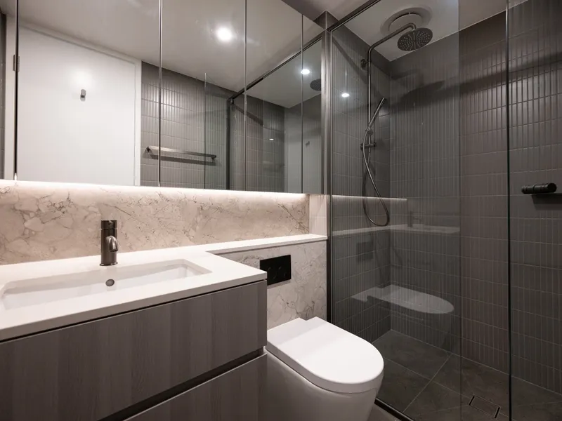 - Modern bathroom with mirrored storage