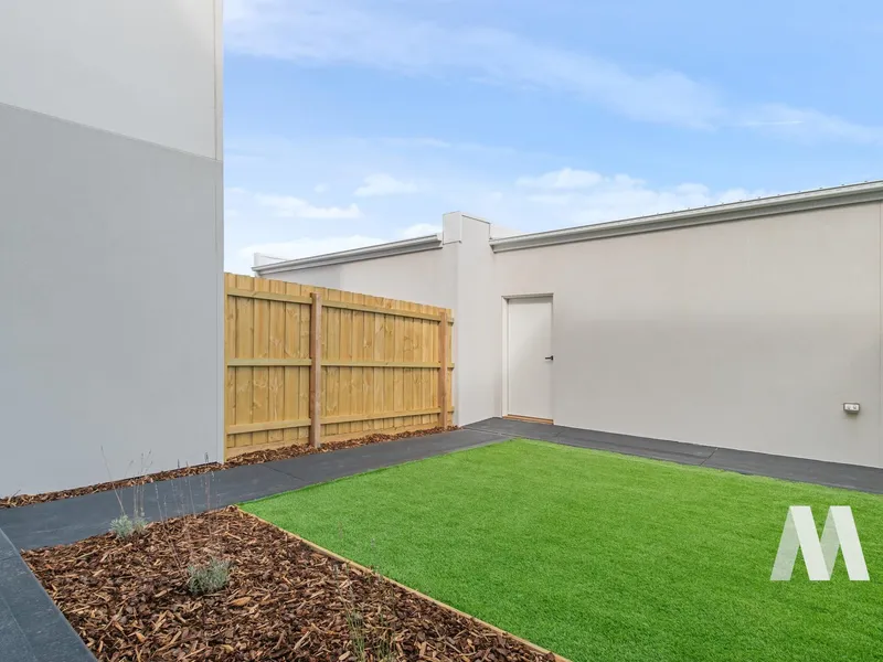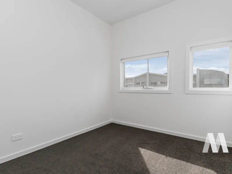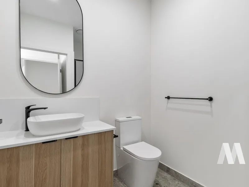 The ground floor showcases a light-filled open-plan layout, seamlessly connecting the kitchen, dining, and living areas. The contemporary kitchen is fitted with stone benchtops, stainless steel appliances, and generous storage, making it both practical and stylish. The living space extends out to a private garden—ideal for entertaining or simply unwinding. A powder room and separate laundry add everyday convenience.