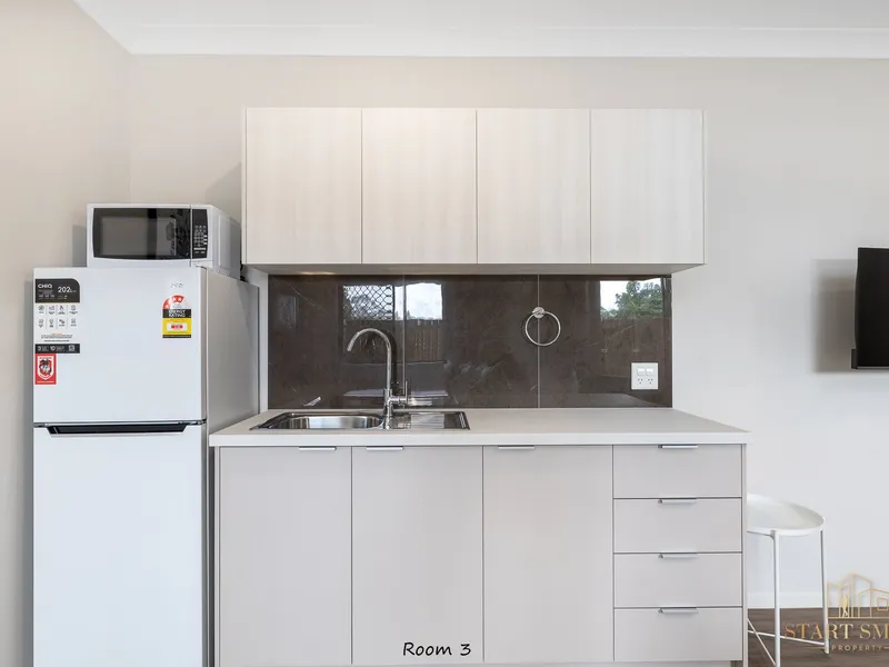 Access to a shared laundry with washing machines, shared kitchen, lounge room and outdoor area