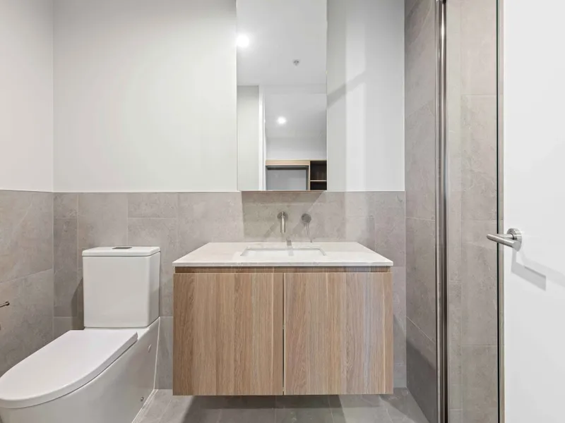 / Bathrooms feature a semi-frameless shower, a custom vanity with storage, and a 20mm reconstituted stone benchtop;
