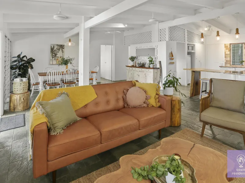 Inside, the light-filled open-plan living area is designed for comfort and everyday living, complemented by the furnishings and a well-equipped kitchen. The cosy lounge offers a welcoming space to relax, while the two inviting bedrooms are both fitted with air conditioning for added comfort. The home includes one well-appointed bathroom and a functional layout suited to a relaxed coastal lifestyle.