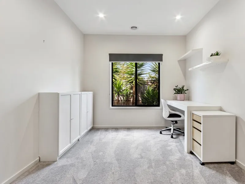 The home offers multiple living zones, including a formal lounge with bookshelf, a spacious open-plan living and meals area, and a dedicated study fitted with a desk and movable drawers, perfect for those working from home. The main living area comes furnished with a leather lounge suite, coffee table, side table, TV unit and dressing table with stool, while the meals space includes a six-seater dining table, chairs and buffet.