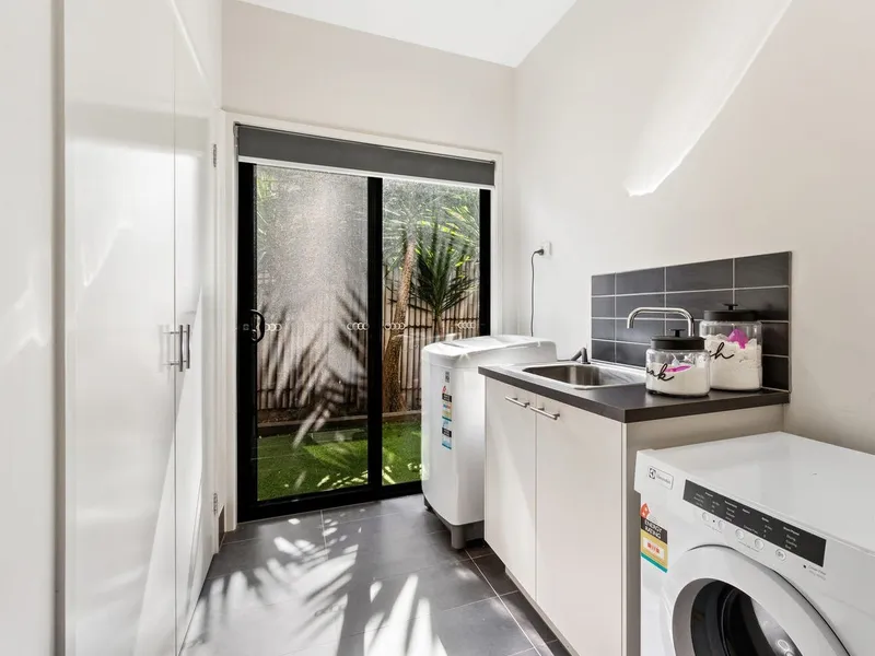 The central bathroom includes a bathtub and separate shower, complemented by a separate powder room for added convenience. The laundry offers built-in cabinetry and comes complete with a washing machine and dryer.