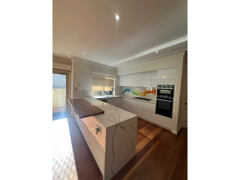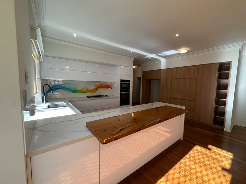- Designer kitchen featuring stone benchtops, breakfast bar, gas cooktop, quality appliances, ample storage, and a seamless connection to the main living and dining area