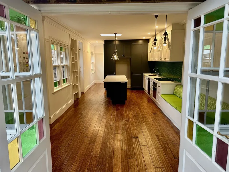* Oak floorboards t/out, terrazzo benchtops