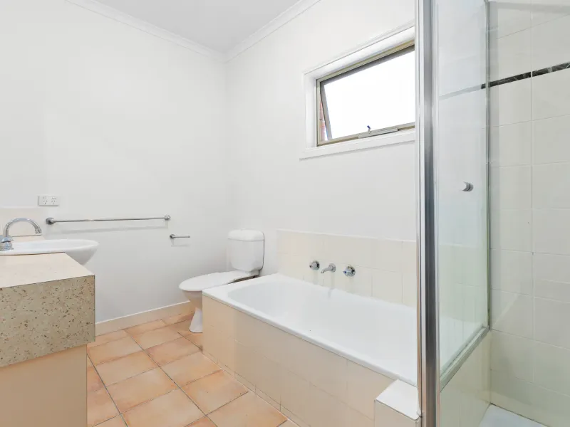 The main bedroom enjoys a private ensuite, while a central bathroom with a bathtub serves the second bedroom with comfort and style. Additional highlights include laundry with courtyard access, a downstairs powder room, heating and cooling throughout, and a single lock-up garage with internal entry.