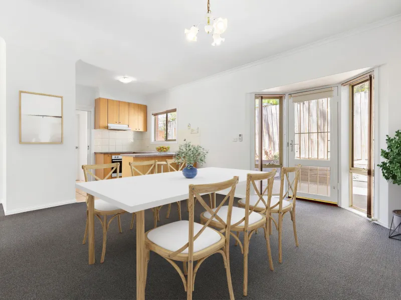 The dining area opens onto a private courtyard, offering a tranquil setting for alfresco dining, morning coffee, or effortless entertaining. Upstairs, two spacious bedrooms with built-in robes are bathed in northern light and both open to a sunny balcony with a leafy outlook.