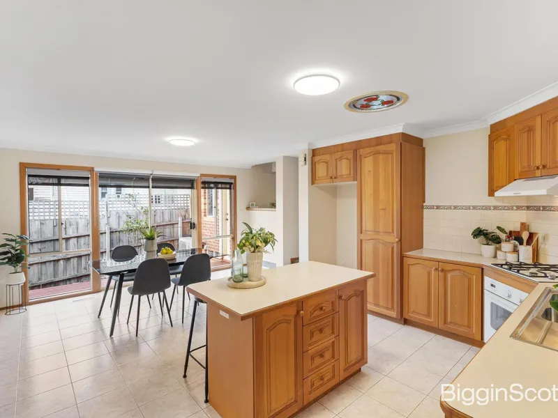 Step inside to a welcoming entry that flows seamlessly into a spacious living area, perfect for relaxing or entertaining. The open-plan kitchen and dining space is a highlight, featuring timeless wood-paneled cabinetry, a gas stove, Westinghouse oven, Bosch dishwasher, and a convenient island bench with breakfast bar. Sliding doors lead out to a sunny deck overlooking the low-maintenance yard and concrete courtyard-an ideal spot for enjoying morning coffee or hosting friends and family.