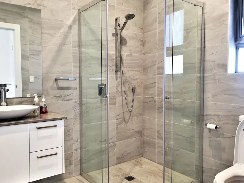 } Three modern, airy bathrooms, one of them has a bath tub