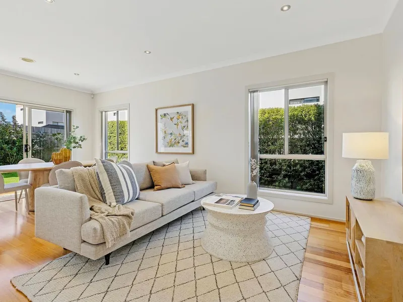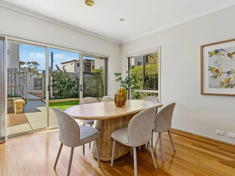 Timber floating floors connect seamlessly through to the open-plan dining and family area, where sliding doors invite in natural light and provide easy access to the garden.