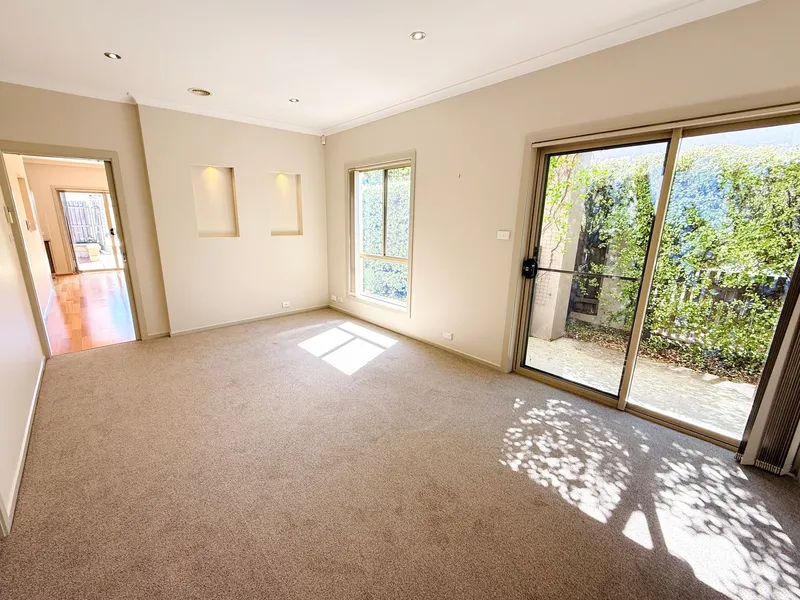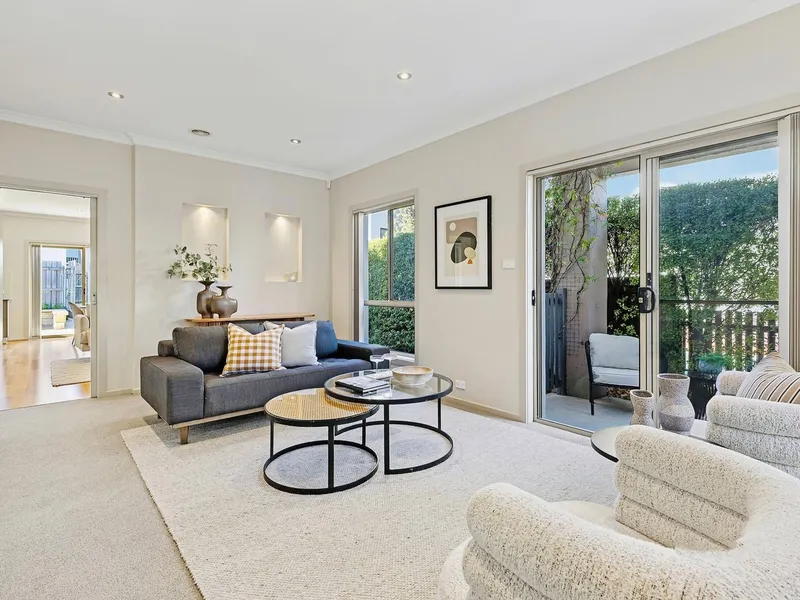The master bedroom is privately positioned on the ground floor and appointed double wardrobes with mirrors and a stylish ensuite. A large feature window provides an elegant outlook over the landscaped front garden, while privacy fencing ensures a secluded and peaceful atmosphere.