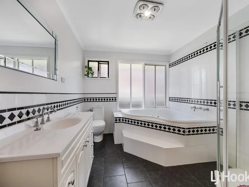 The master bedroom is privately positioned and features a walk-in robe and ensuite, while the remaining three bedrooms include built-in robes and are serviced by a central bathroom with separate shower and bath, plus a separate toilet for added convenience.