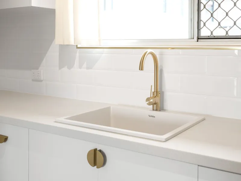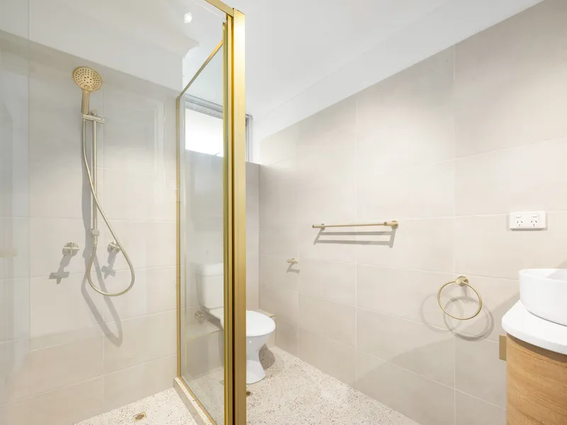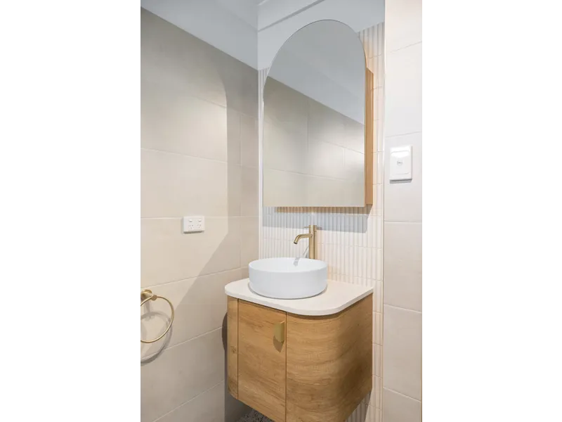 - Terrazzo tiled bathroom with oak vanity, stone benchtop & Nero tapware