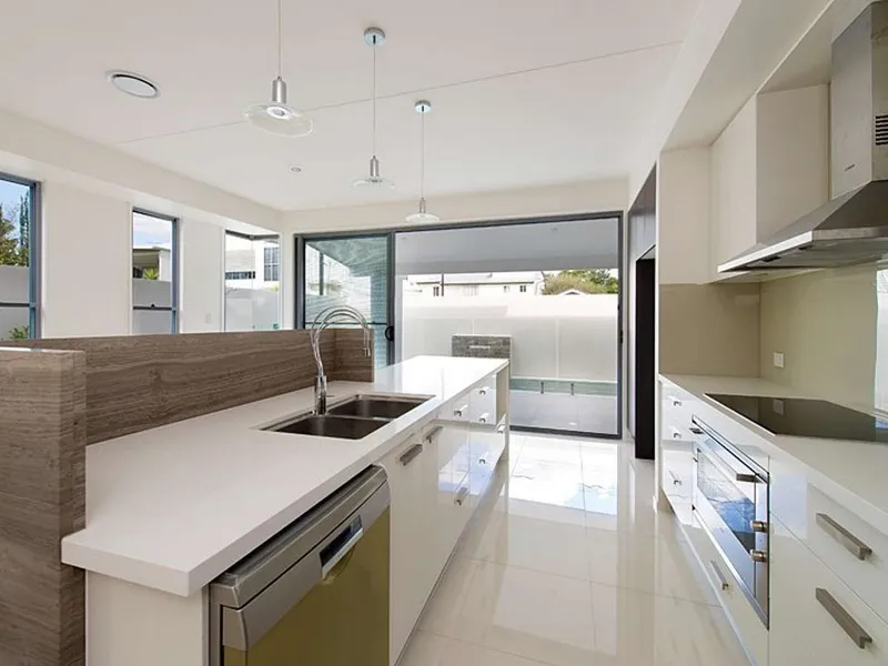- Sleek stone kitchen offers high-end European appliances including dishwasher