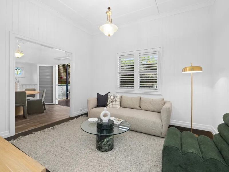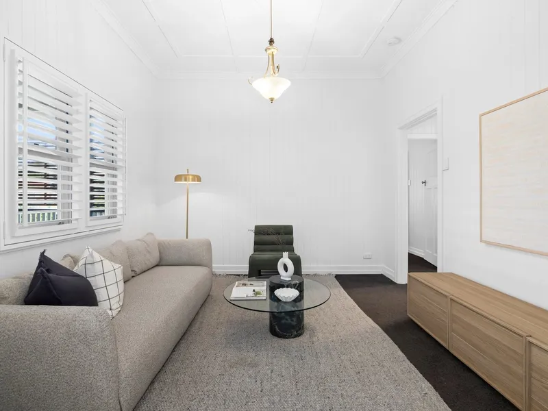 Showcasing a classic aesthetic, the dual-level residence is presented with hoop pine timber floors, VJ walls, lofty ceilings and double-hung sash windows.