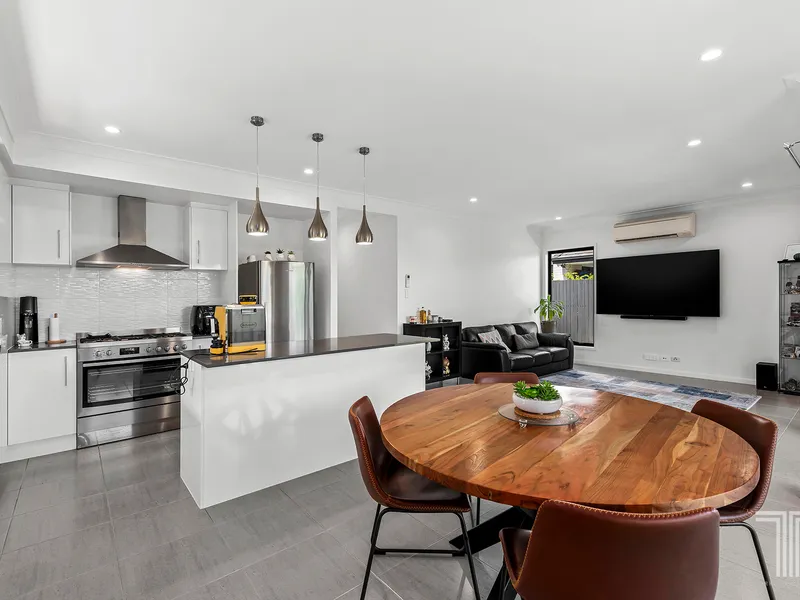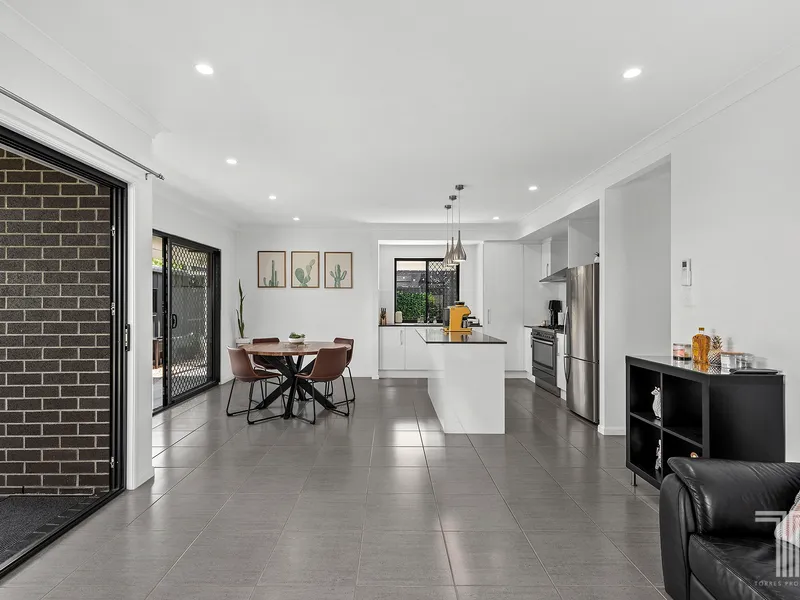 The open-plan living and dining area flows seamlessly to a generous outdoor entertaining space, perfect for hosting family and friends or simply enjoying relaxed weekends at home. The upgraded, oversized oven will delight home cooks, while the light-filled interiors provide a welcoming sense of space.