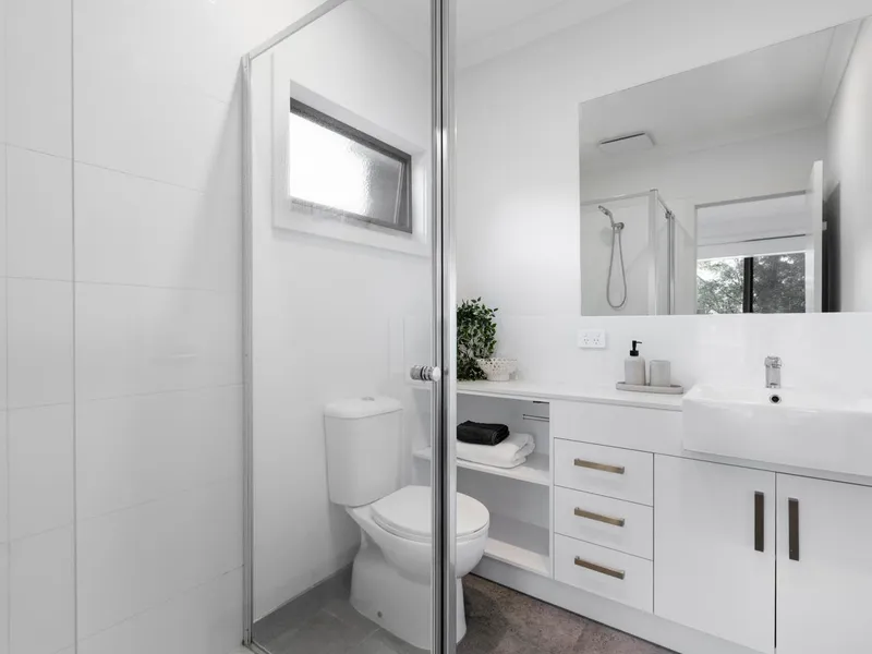Designed with a clever reverse floorplan, both spacious bedrooms (each with ensuite) are tucked away downstairs for complete privacy, while the first floor is dedicated to an expansive open-plan living zone. Vaulted ceilings amplify the sense of space, while a large balcony provides effortless indoor-outdoor entertaining.