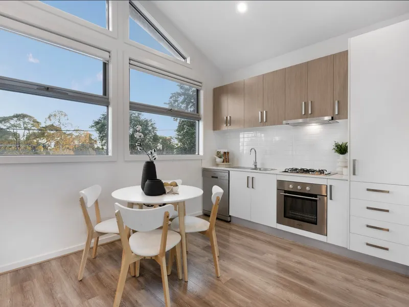 The sleek kitchen features stainless steel appliances and a modern design, complemented by warm timber floors and serene leafy vistas that enhance the townhouse’s relaxed, sophisticated vibe. Additional highlights include a guest powder room, split-system heating/cooling throughout, a large laundry, and secure single-car parking.
