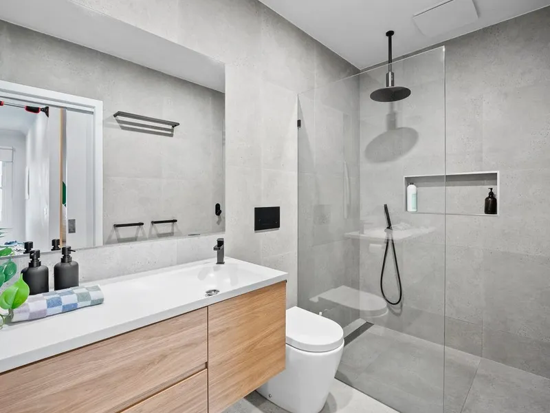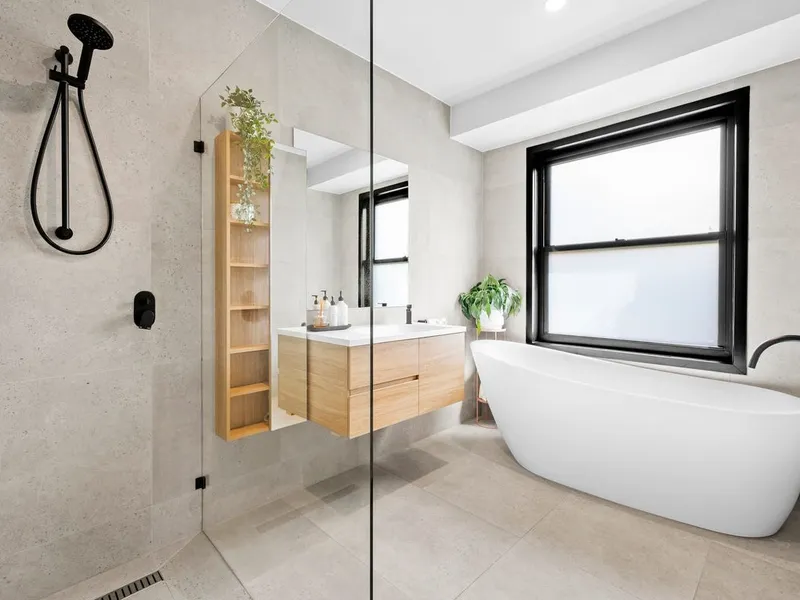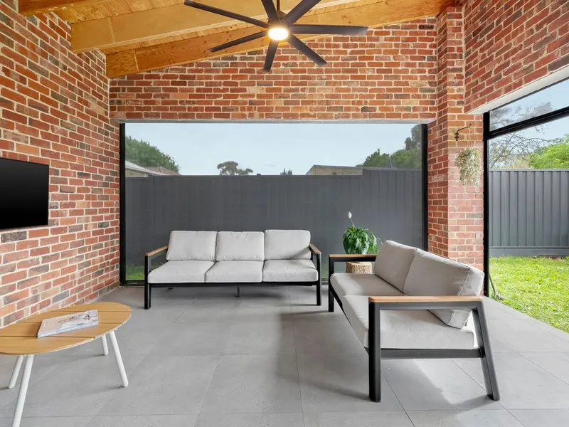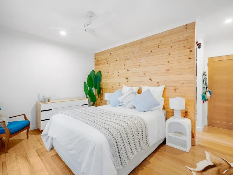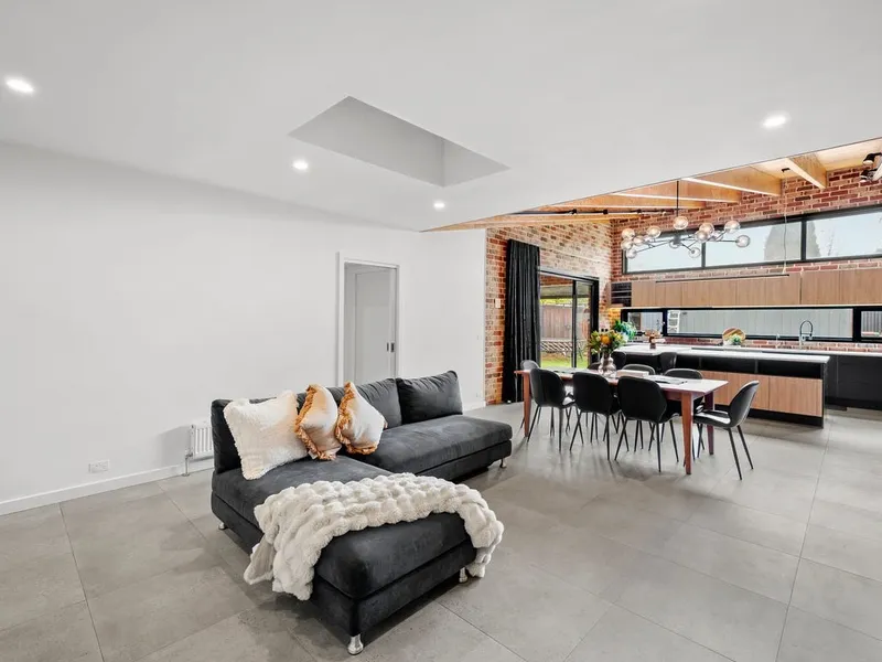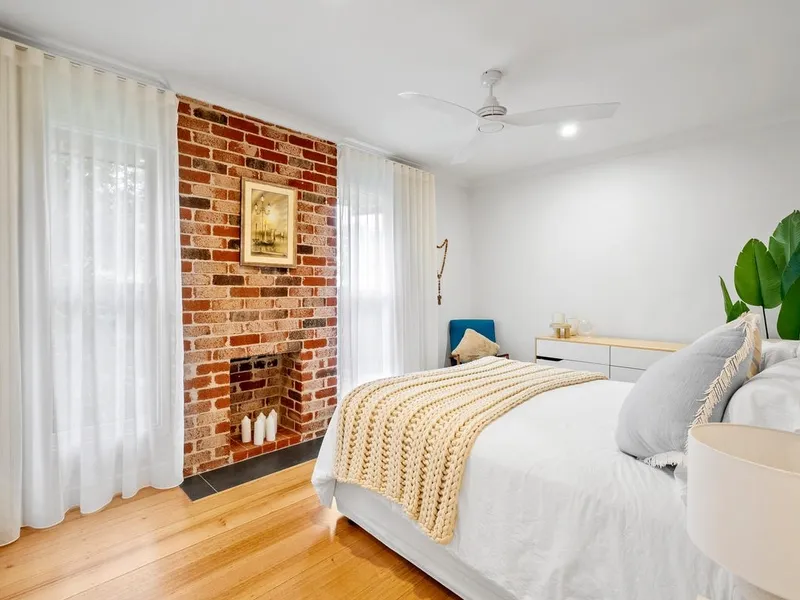 The heart of the home is the expansive open-plan living and dining domain, where soaring timber-lined ceilings and exposed brickwork create striking architectural impact. Large windows flood the space with natural light, while a wood fireplace forms a beautiful focal point and adds warmth through the cooler months. The gourmet kitchen is finished to an exceptional standard, showcasing stone benchtops, quality appliances, extensive cabinetry and an oversized island bench designed for both everyday living and effortless entertaining. A refrigerator is included, adding further convenience to an already impressive space. Accommodation is equally impressive, with light-filled bedrooms featuring polished timber floors, plantation shutters and ceiling fans, creating spaces that are both refined and functional. The luxurious central bathroom would not look out of place in a designer magazine, complete with a freestanding bath, a walk-in shower with matte black fittings, a floating timber vanity and premium fixtures throughout. A washing machine is also included, making the home move-in ready from day one.