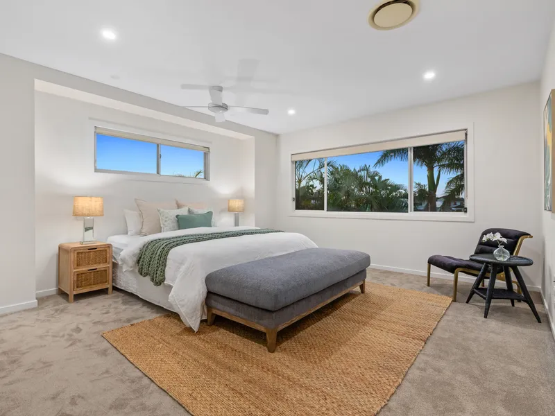 With four expansive bedrooms, each featuring a private en-suite bathroom, including two with walk-in robes, this home is the epitome of refined living. Situated on a huge 815m² block with 16.2 meters of pristine waterfront and a private pontoon, it offers unparalleled access to the serene waterways.