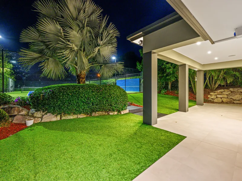 Designed for entertaining and multi-generational living, the property offers four generous bedrooms plus a dedicated office, a games/media room and three bathrooms plus a powder room. Indoor comfort is matched by extensive outdoor lifestyle areas, including a large alfresco entertaining pavilion with built-in BBQ, an outdoor spa, pool and a full-size recently refurbished, flood lit, tennis court — ideal for active families and social gatherings.
