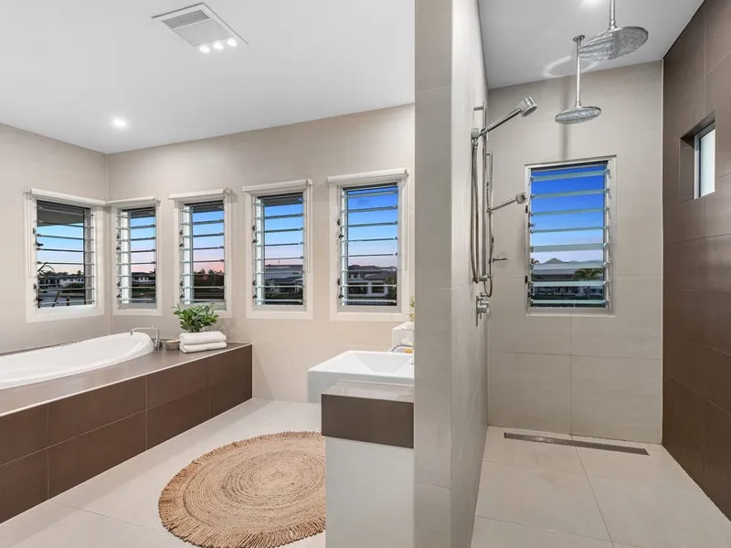 Upstairs, a sunlit rumpus opens to three oversized bedrooms, each with a walk-in robe. The master suite is a private escape, featuring a private balcony capturing spectacular hinterland sunsets, plus a luxe ensuite with his-and-hers showers and vanities.