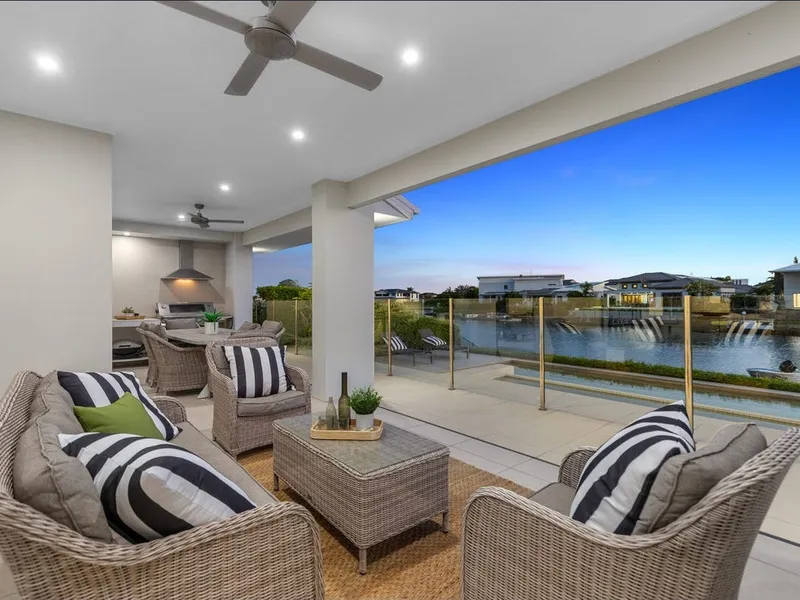 Every space has been crafted to enhance light, flow, and connection to the water. Expansive glazing, soaring ceilings and seamless indoor–outdoor transitions create a home that feels both grand and effortlessly serene. The heated pool with inbuilt spa and seating zone takes centre stage outdoors, positioned alongside multiple alfresco spaces, a built-in BBQ, and your own private pontoon with Broadwater access.