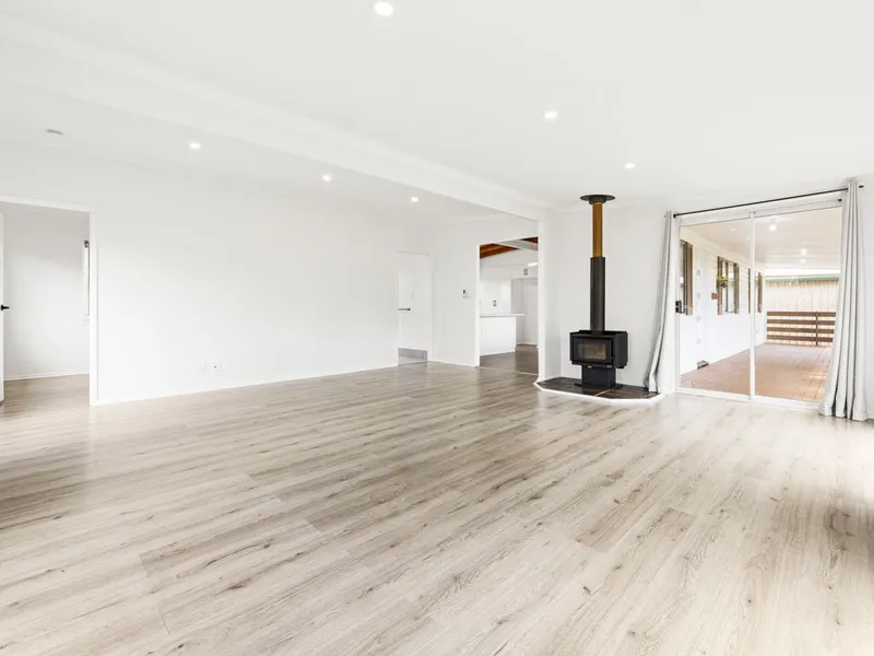The home provides multiple living zones designed for both relaxation and everyday living. A separate carpeted lounge room positioned at the front of the home features a ceiling fan and large windows that allow excellent natural light to fill the space. Toward the rear, a spacious open plan tiled kitchen and dining area forms the heart of the home, complete with split-system air-conditioning and ceiling fan, with sliding doors providing direct access to the outdoor entertaining area.