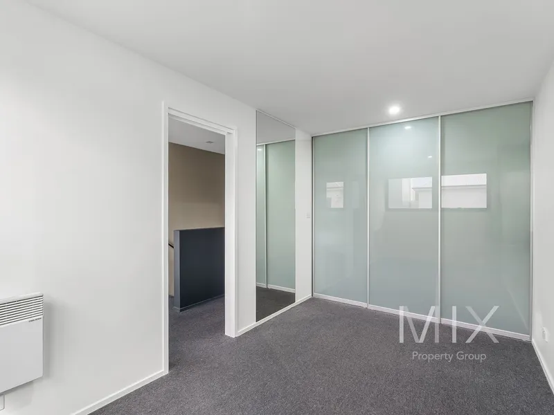 Upstairs, the master bedroom is a true retreat, featuring full-width windows that flood the space with natural light and offer stunning views. With three separate built-in robes and elegant white cabinetry, storage is abundant. The second bedroom, with a walk-in robe, generous windows, and sliding door access, is adjacent to a handy study nook. The contemporary bathroom is stylishly appointed with sleek surfaces and ample space.