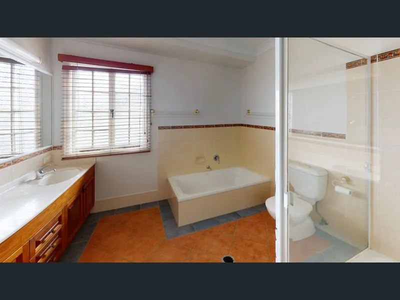 - Large bathroom with shower, dual sinks, bath and toilet.