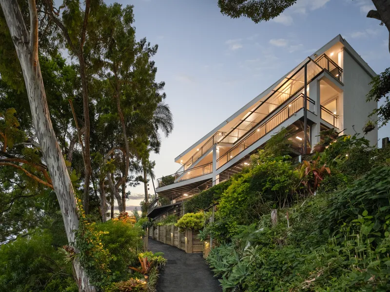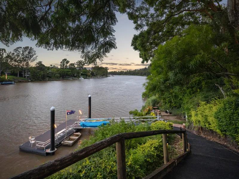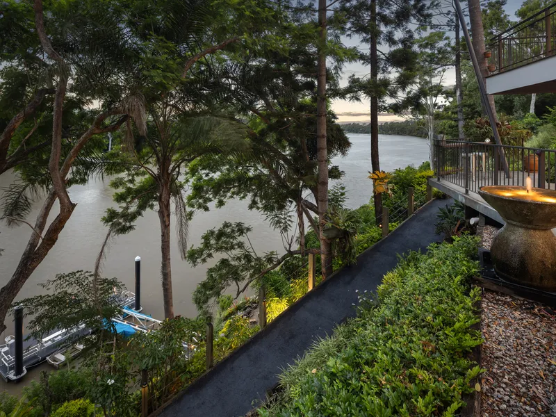 Nestled in a private, riverside cul-de-sac, this commanding Indooroopilly residence offers three levels of opulent living with uninterrupted 180-degree Brisbane River and city views.