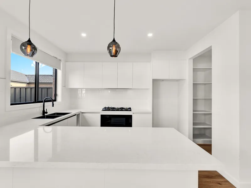 40mm stone benchtops with waterfall edge, tiled splashback, soft-close cabinetry, and walk-in pantry.