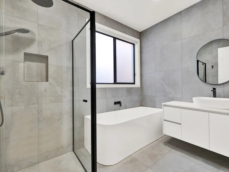 Main bathroom with luxury finishes, stone benchtops, deep soaking tub, and premium tapware.