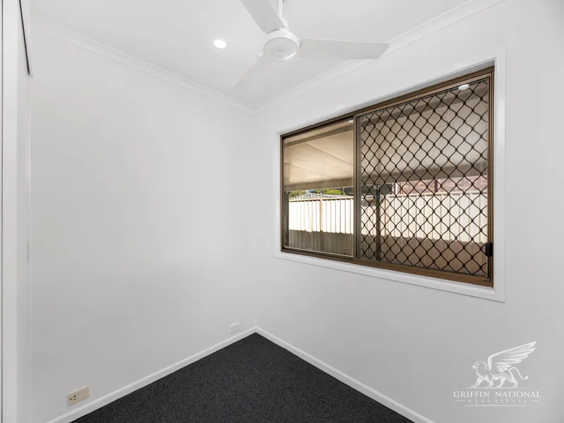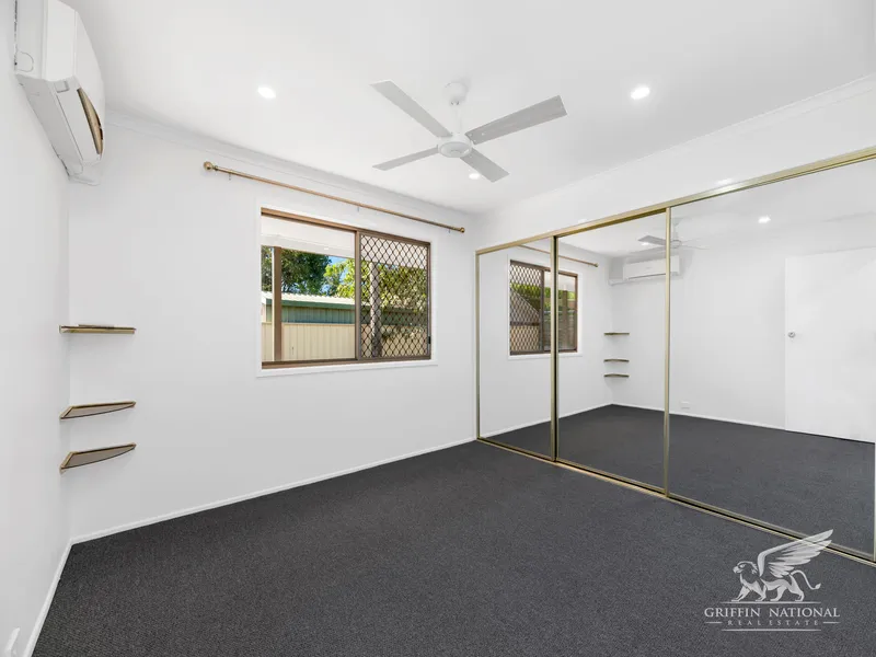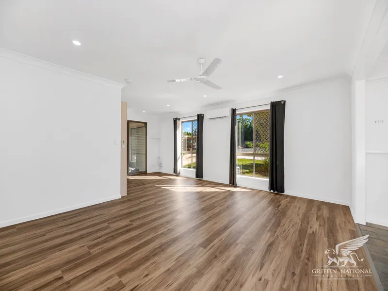 This large family home has been fully repainted internally and has had new flooring installed throughout. Fresh and spacious, the home has four bedrooms plus a study which could also be used as a fifth bedroom, all with built-in robes, as well as a small sunroom with an extra storage cupboard. The living and dining areas are air-conditioned and the kitchen is connected by a glass sliding door to a large patio with a shade sail in the yard. There's a garden shed for your toys and vehicle side access through the remote-controlled carport, too!