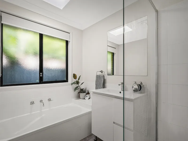 • The main bathroom comes complete with a shower with a waterfall head, vanity, bathtub, and separate toilet for convenience
