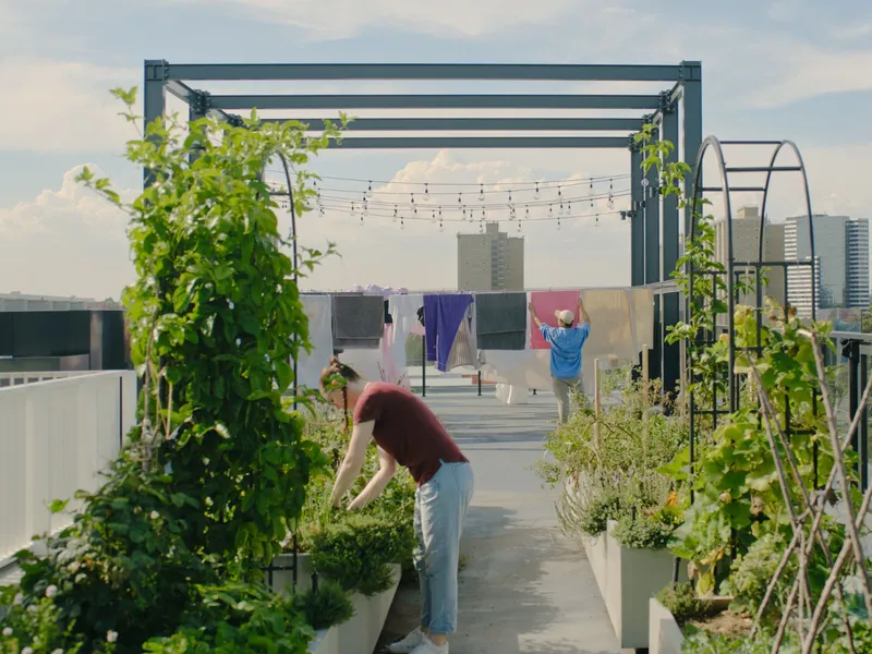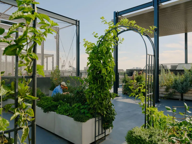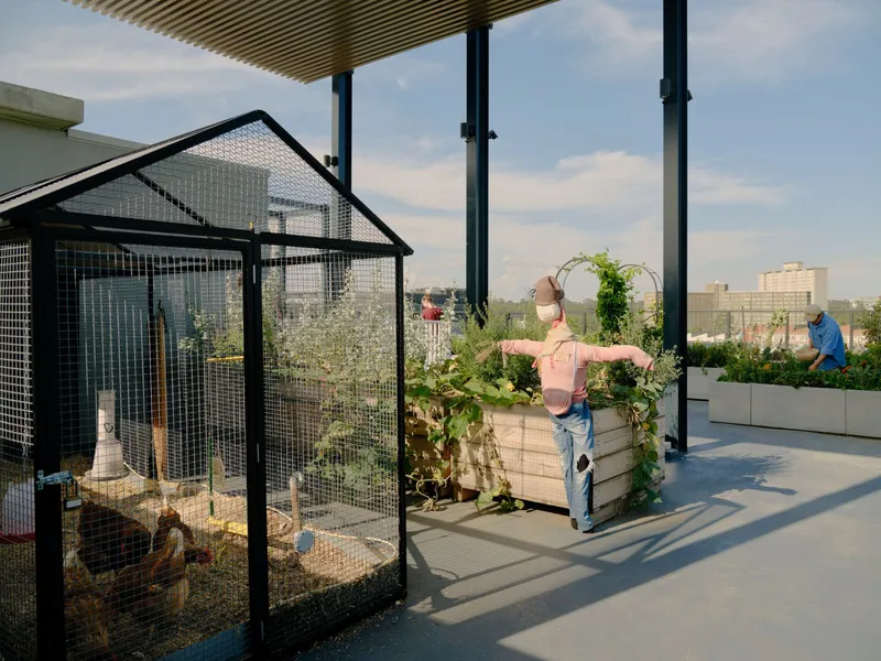 - Rooftop veggie and herb gardens, plus chickens cared for by residents