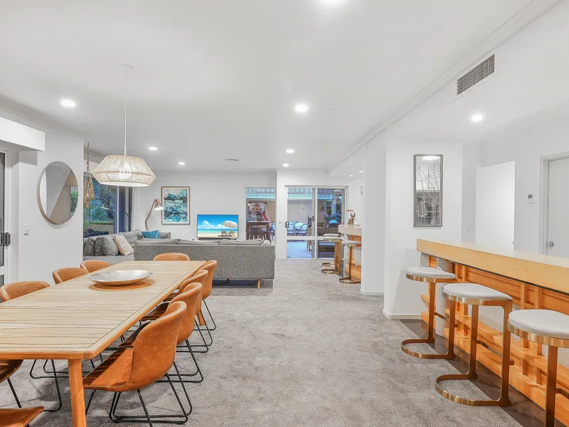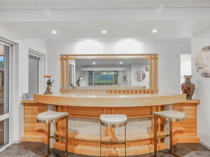 Inside, the home includes multiple living and entertaining areas, an indoor curved solid timber bar servicing living room, piano room and sauna. The property is fully furnished and includes a well-equipped kitchen, internal laundry and TVs in each bedroom. Air-conditioning and ceiling fans provide year-round comfort. The home is also equipped with a 15kW solar panel system to support energy efficiency.