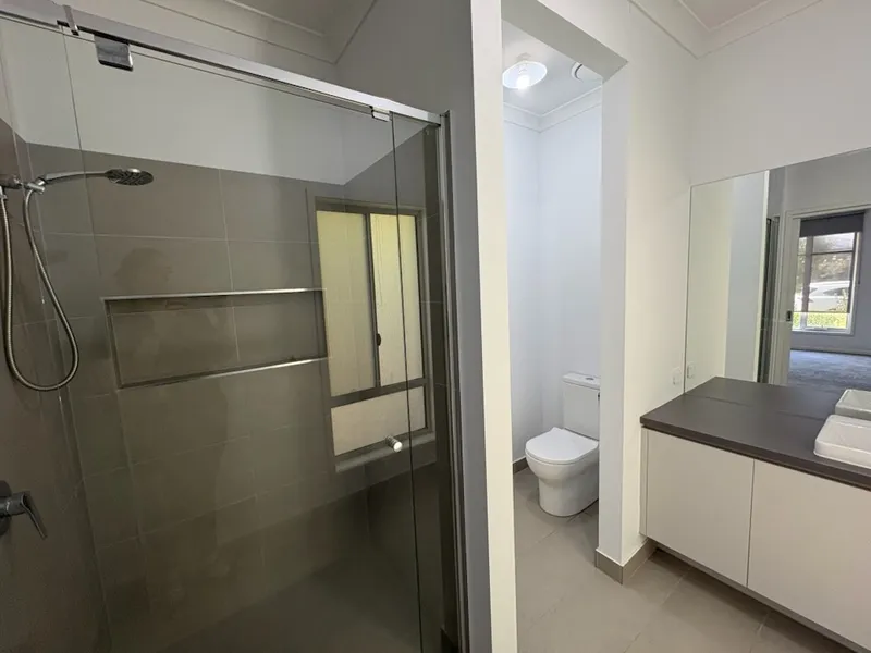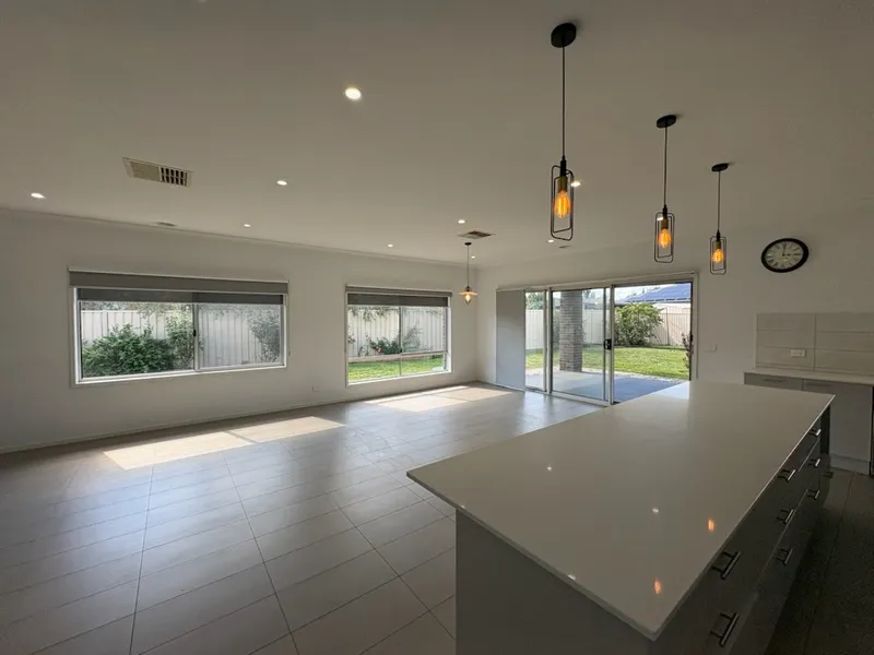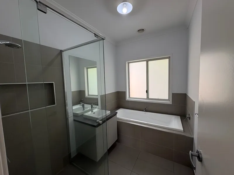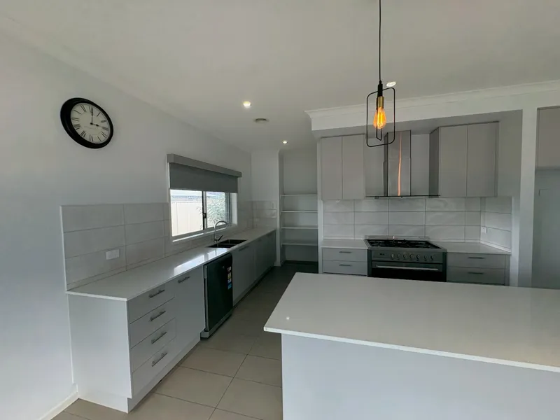 Boasting four generous bedrooms, the master suite is privately positioned at the front of the home and features a large walk-in robe and a sleek ensuite complete with an oversized shower and toilet. The remaining three bedrooms are all fitted with built-in robes and are serviced by a stylish family bathroom with a bath, shower, and separate toilet. The home offers two spacious living areas, with the heart of the home being the bright open-plan kitchen, dining, and living space. The well-appointed kitchen includes a gas cooktop, electric oven, dishwasher, walk-in pantry, and ample bench and storage space—ideal for everyday living and entertaining.