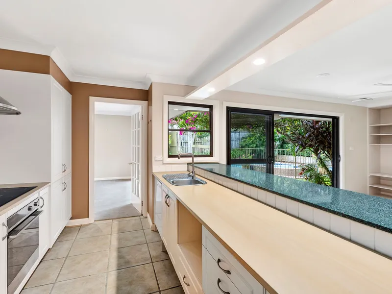 • Large Kitchen, stone servery bench, Asko dishwasher, open plan casual living/dining.