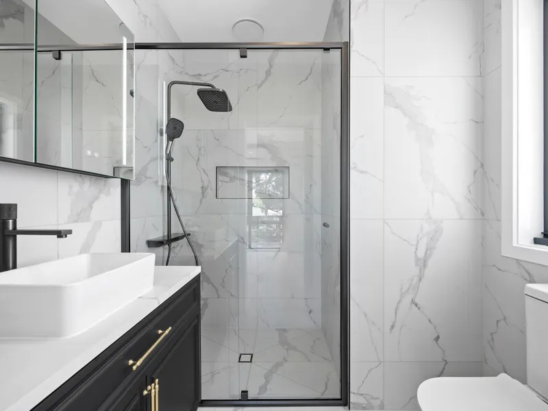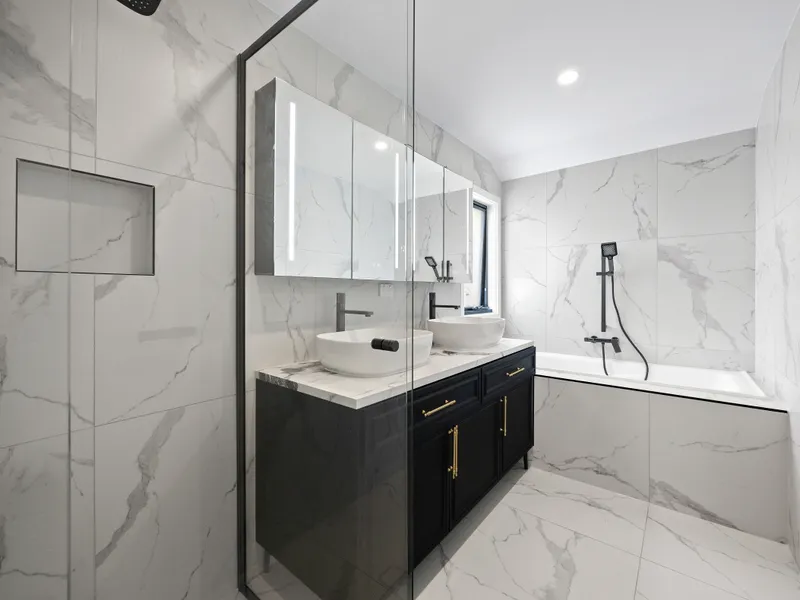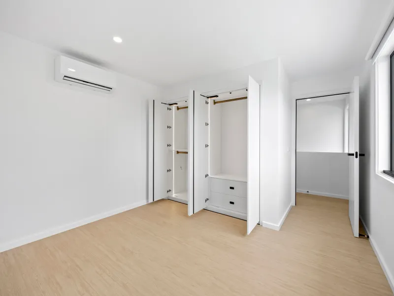 The master suite is conveniently positioned on the lower level, offering a serene retreat with a walk in robe fitted with custom hanging systems and LED lighting, along with a beautifully finished ensuite featuring brass gunmetal tapware, a thermostatic rain shower, and a smart mirror with built in lighting and defogging technology. Upstairs, three further bedrooms deliver comfort and style, each with built in wardrobes and sensor lighting, serviced by an ultra luxury central bathroom and an additional powder room. With a total of two bathrooms and three toilets, the layout ensures practicality for families or shared living arrangements.
