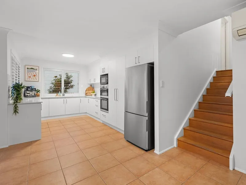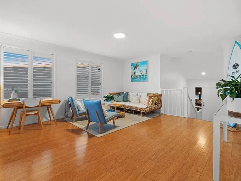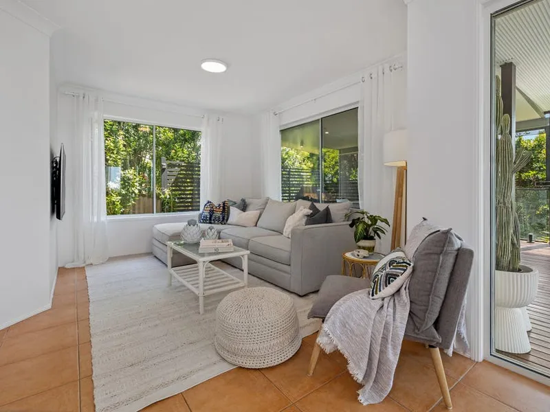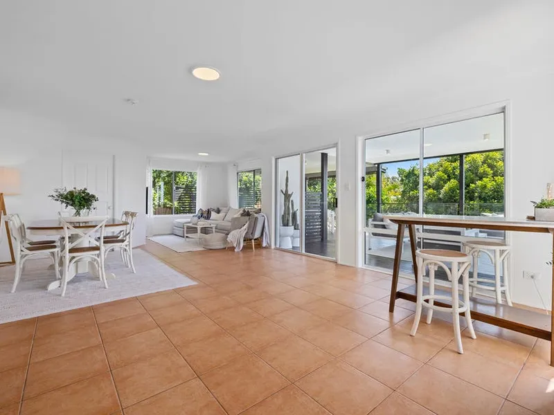 Set in an elevated, tightly held pocket of Kingscliff, this inviting residence captures natural light, coastal breezes, and a real sense of space throughout. Plantation shutters enhance the interiors, adding a refined coastal feel while framing the home’s leafy outlook and glimpses beyond.