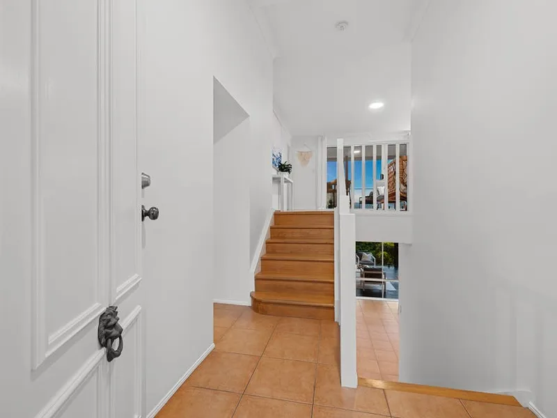 Upstairs, two private balconies capture sweeping ocean and hinterland views, creating the perfect place to unwind and enjoy the sea breeze. With a desirable north-facing aspect, natural light fills the open-plan living areas, which flow seamlessly out to a large undercover outdoor space, ideal for entertaining or relaxed evenings outdoors.