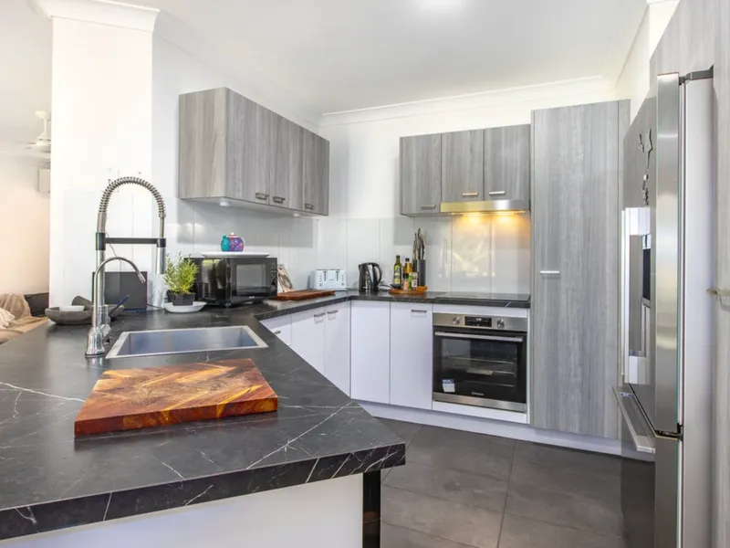 The open-plan living and dining area flows seamlessly to a covered outdoor entertaining space, creating the perfect setting for relaxing or hosting family and friends. The modern kitchen is well equipped with ample storage, quality appliances and generous bench space, making everyday living easy.