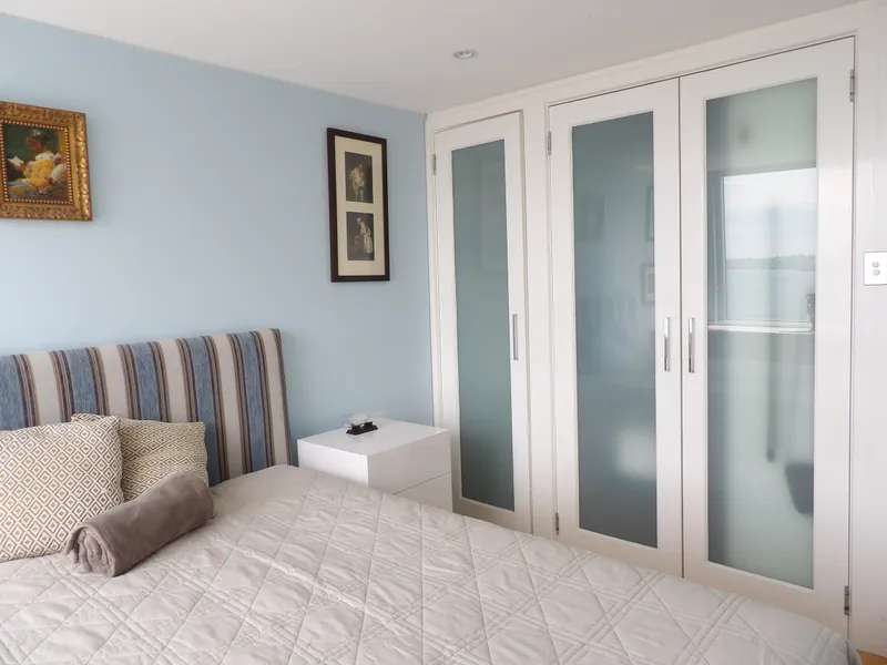 *Large Bedroom with frosted glass built-ins & under window cabinetry